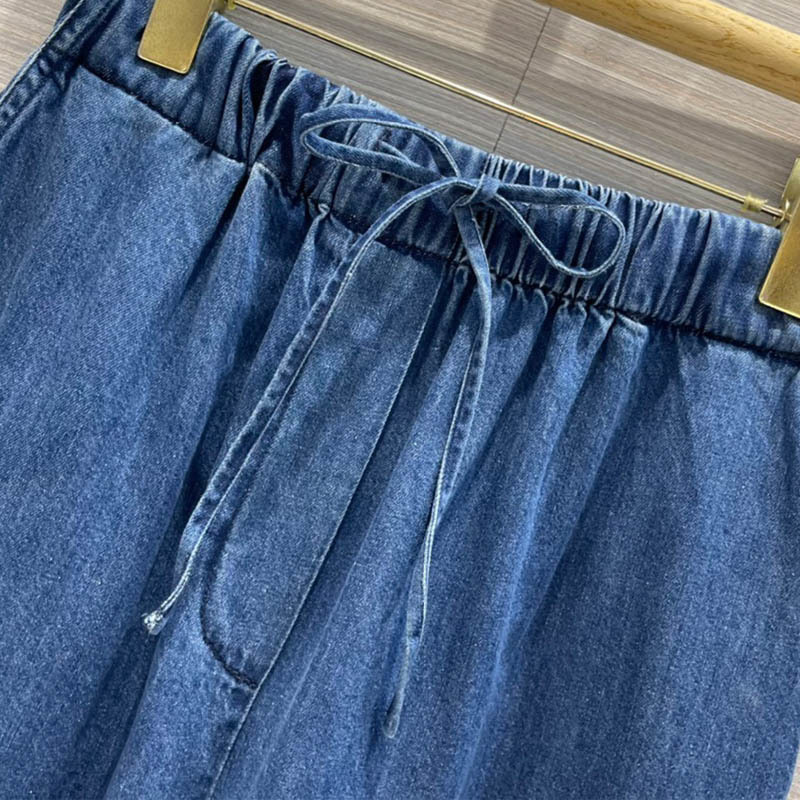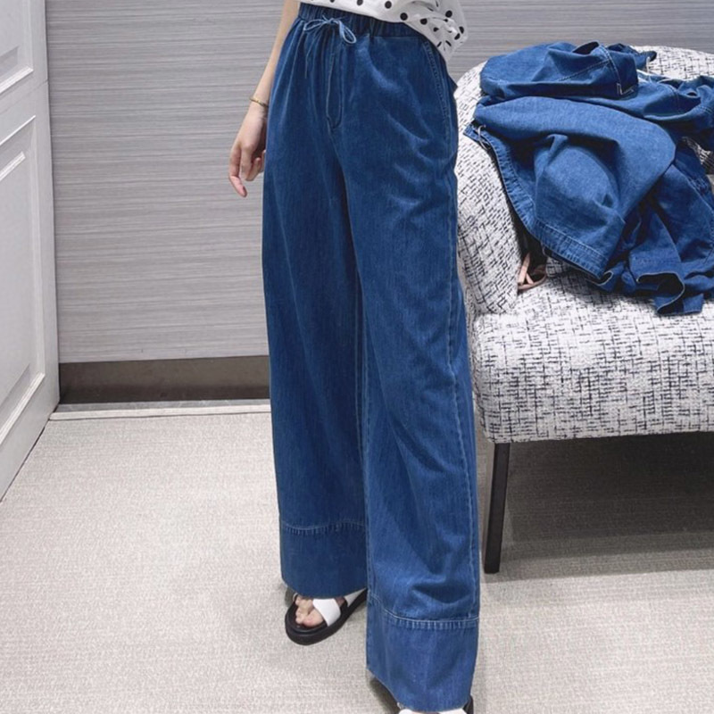22 Summer Elastic Thin Denim Waistband Wide Leg Pants Women Casual Blue Wide Hem Trousers Luxurious V Hardware Straight Trouser