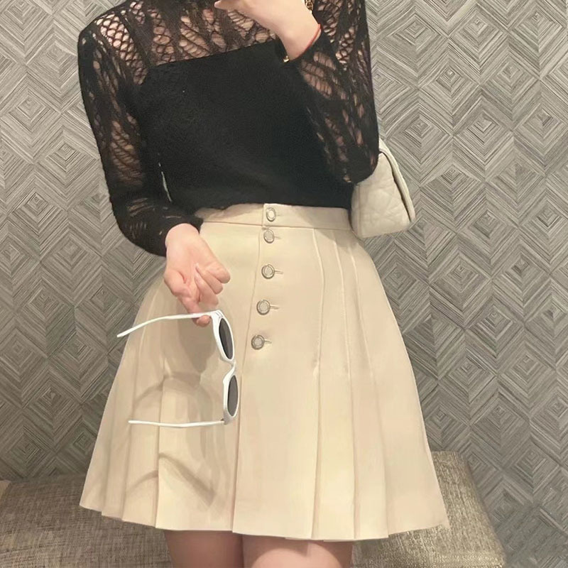 22 Summer Silk Wool Buttons Beige Skirt Women Casual Pleated Blend Black Skirts High Waist Single Breasted Texture Aline Skirts