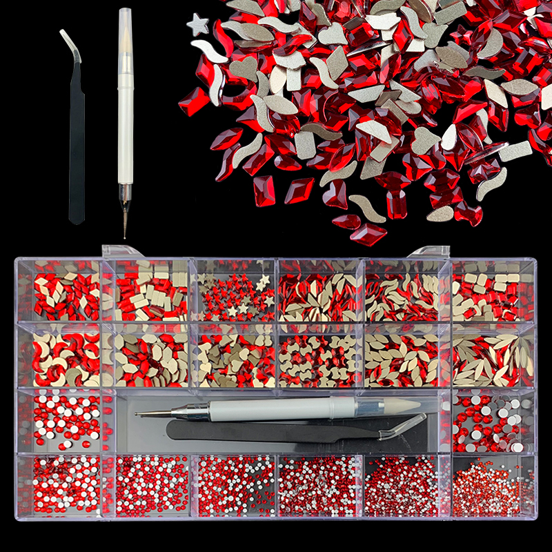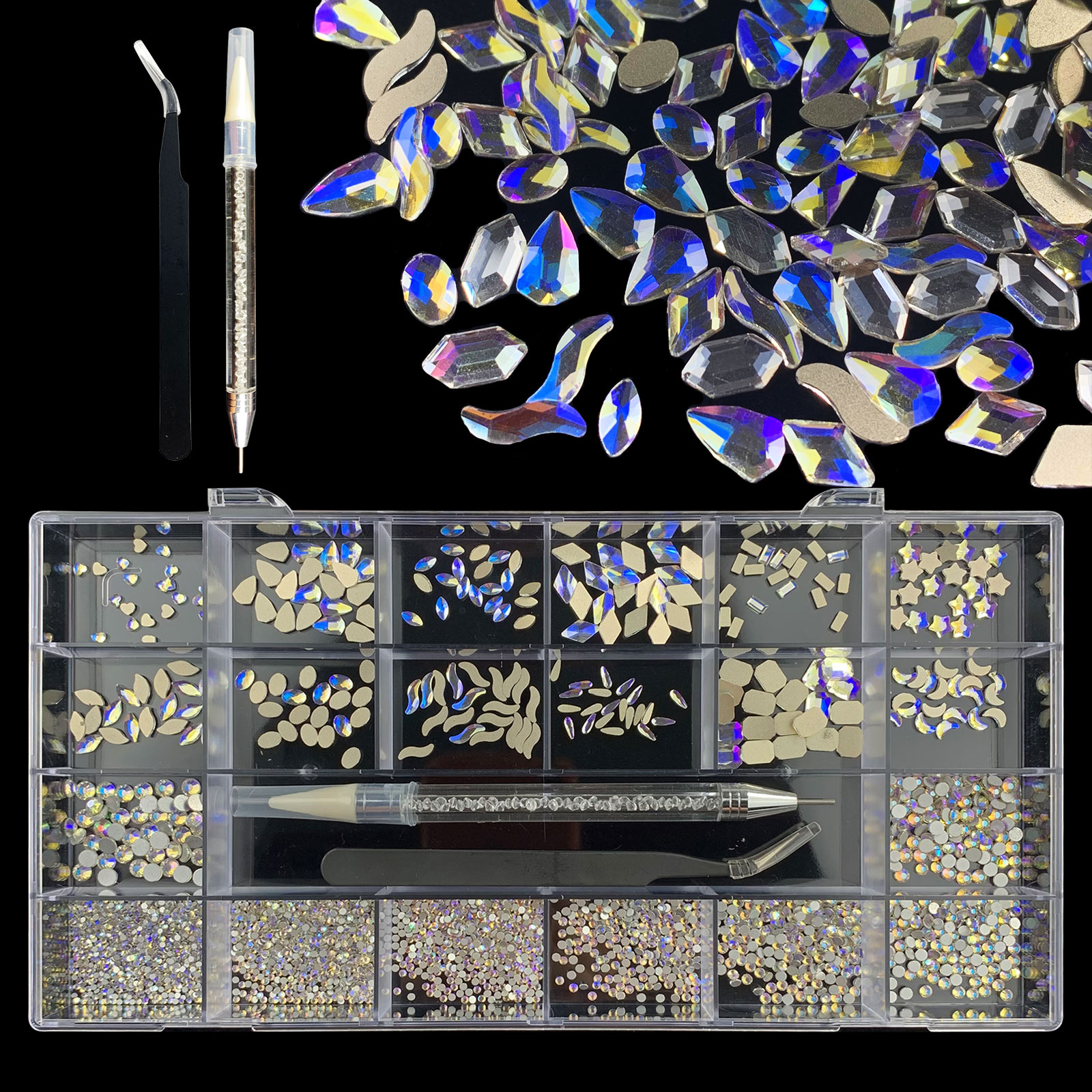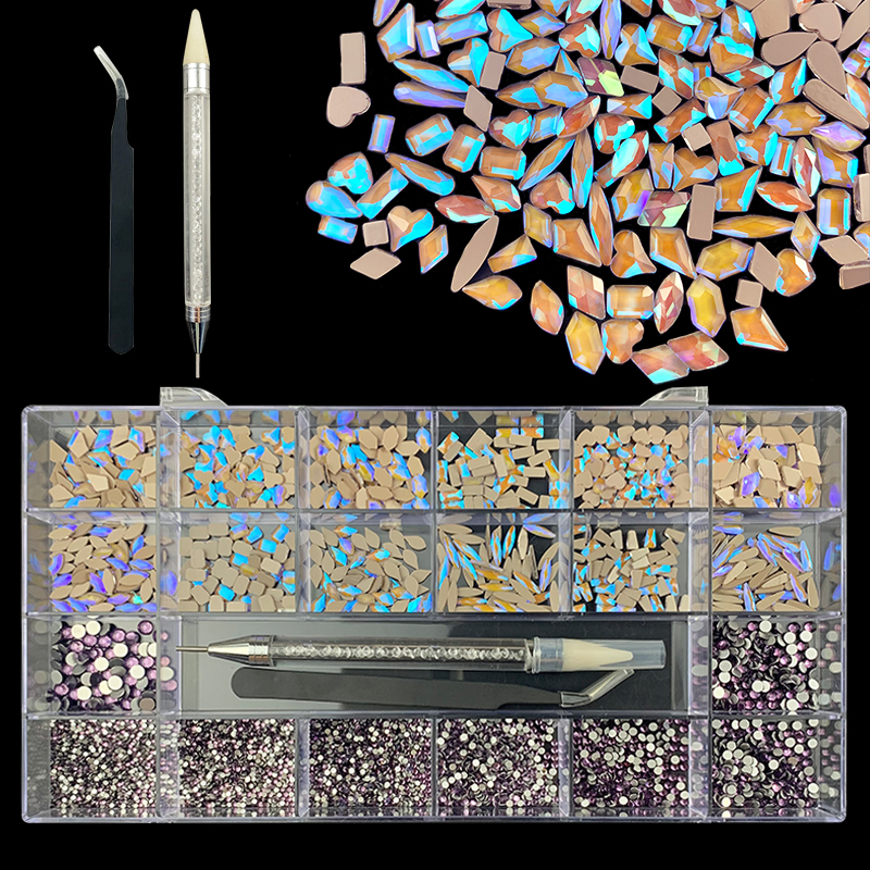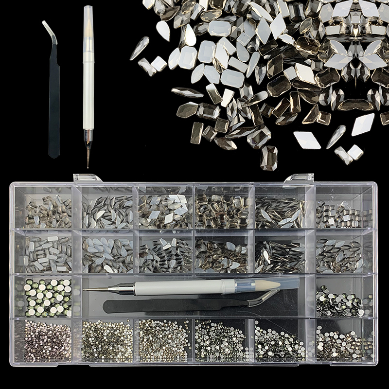 2). 2740pcs Rhinestone set: 240pcs(20x12) k9 crystal glass rhinestones, 2500pcs mix sizes round rhinestones,1pcs wax pen(Crystal or white), 1pcs tweezers for free