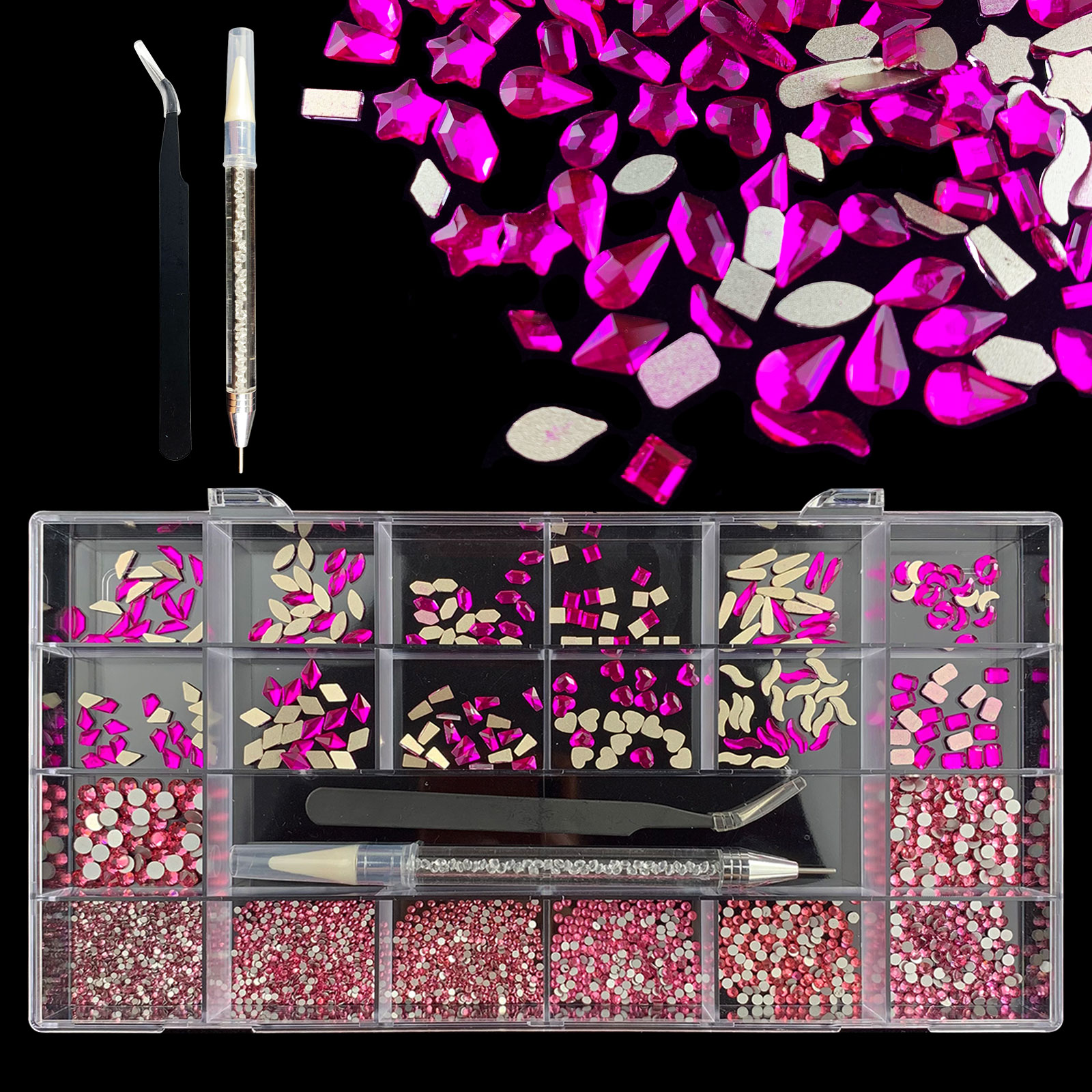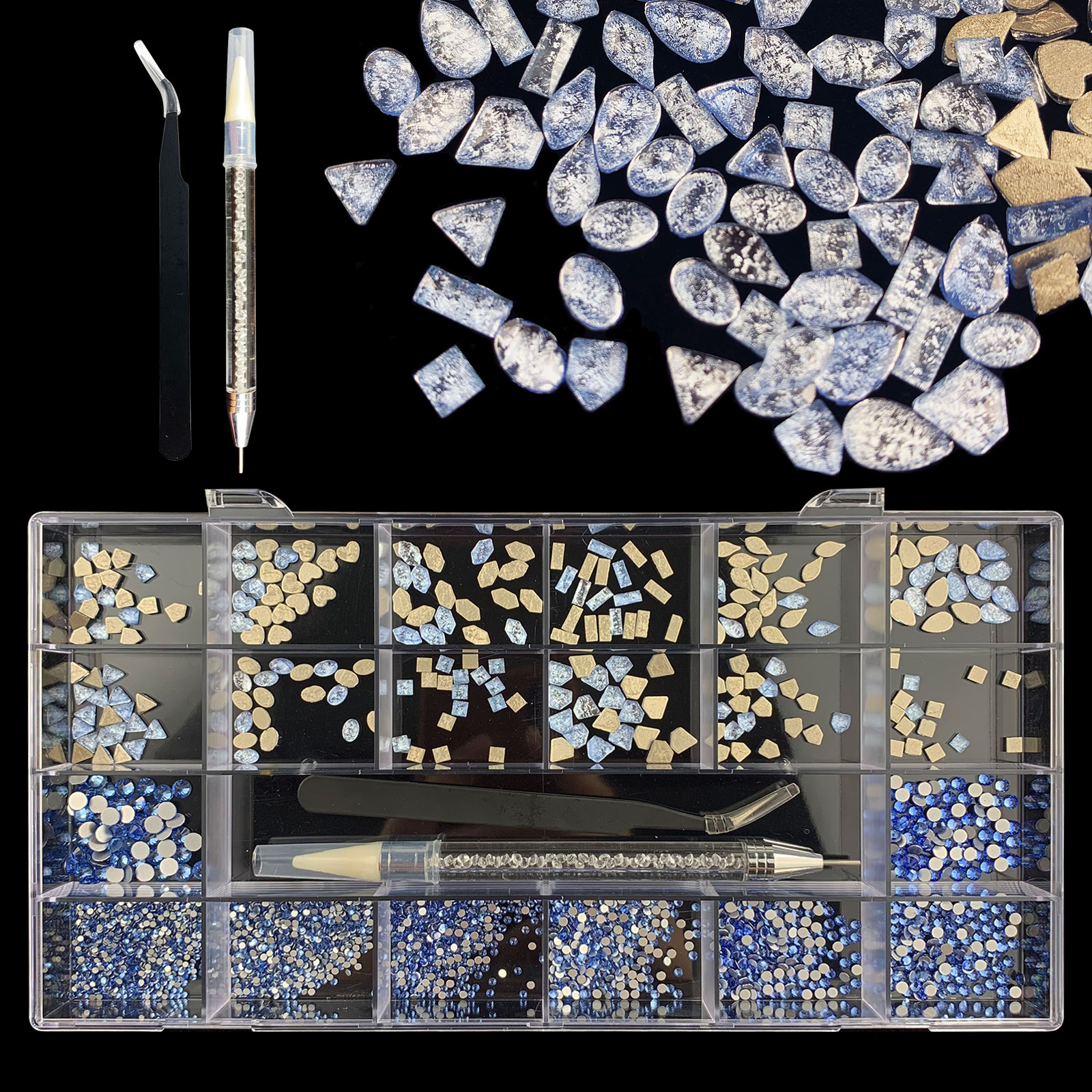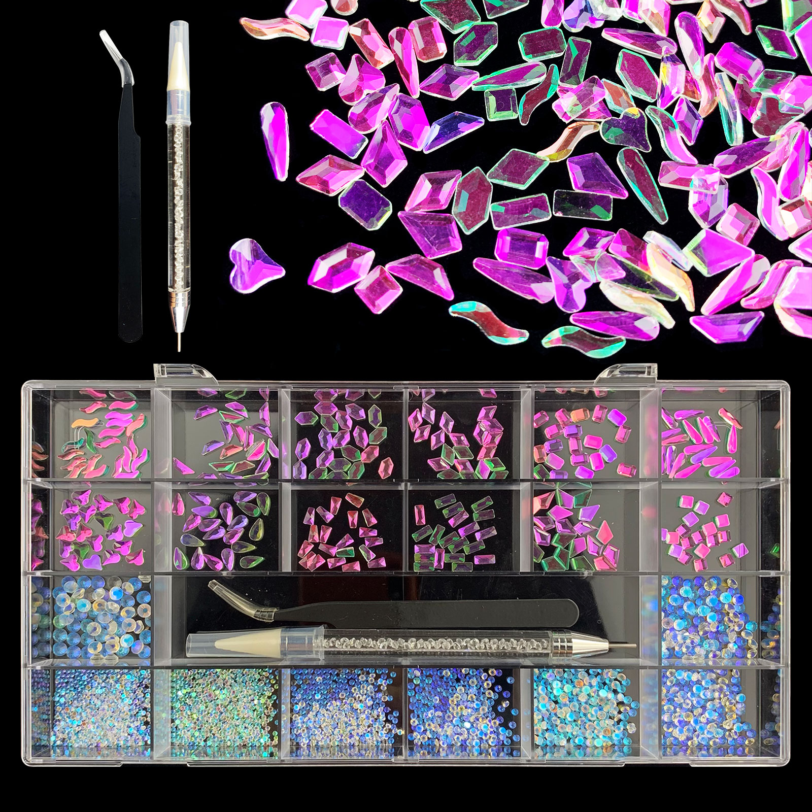2). 2740pcs Rhinestone set: 240pcs(20x12) k9 crystal glass rhinestones, 2500pcs mix sizes round rhinestones,1pcs wax pen(Crystal or white), 1pcs tweezers for free