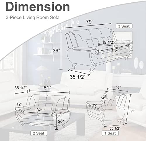 Product Overview Looking to add a fresh look to your living room? It can be difficult to start from scratch, but with a set like this you can round out your seating ensemble with a sleek modern look. Features -This set includes a sofa, armchair, and a loveseat, each padded with foam fill and reinforced with sinuous springs for added durability and support in the seats. -Faux leather upholstery in your choice of hue adorns the seat and back, while pillow top arms and tufting throughout the tight back add more texture and visual intrigue. -Create a sophisticated look with this modern and glamorous set that will no doubt be an eye-catcher in your home. Weights&Dimensions Sofa Seat: 76.5"(L) x 34" (H) x 32.5" (W) Sofa Weight Capacity: 500lb Loveseat Seat: 60"(L) x 34" (H) x 32.5"(W) Loveseat Weight Capacity: 400lb Armchair Seat: 42"(L) x 34" (H) x 32.5" (W) Chair Weight Capacity: 300lb What's Included? -1 x Sofa -1 x Loveseat -1 x Chair