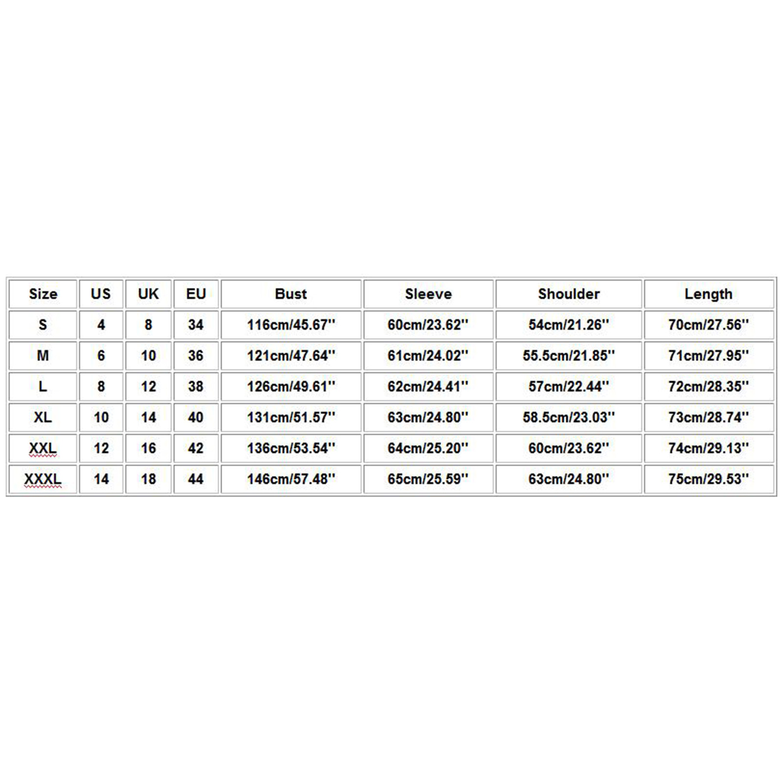 | Size | US | UK | EU | Bust | Sleeve | Shoulder | Length |