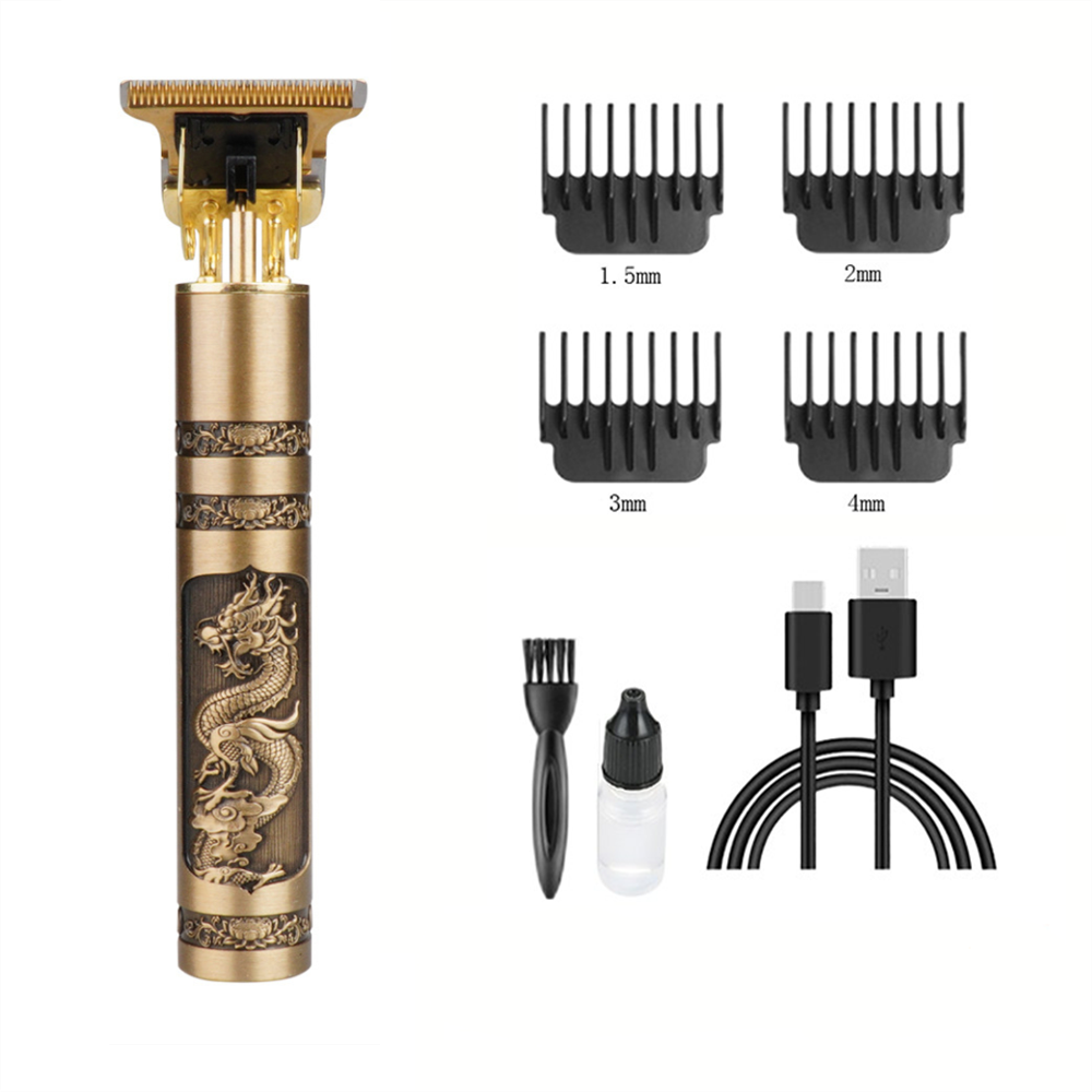 Accessories: USB charging cable, limit comb, cleaning brush, manual.