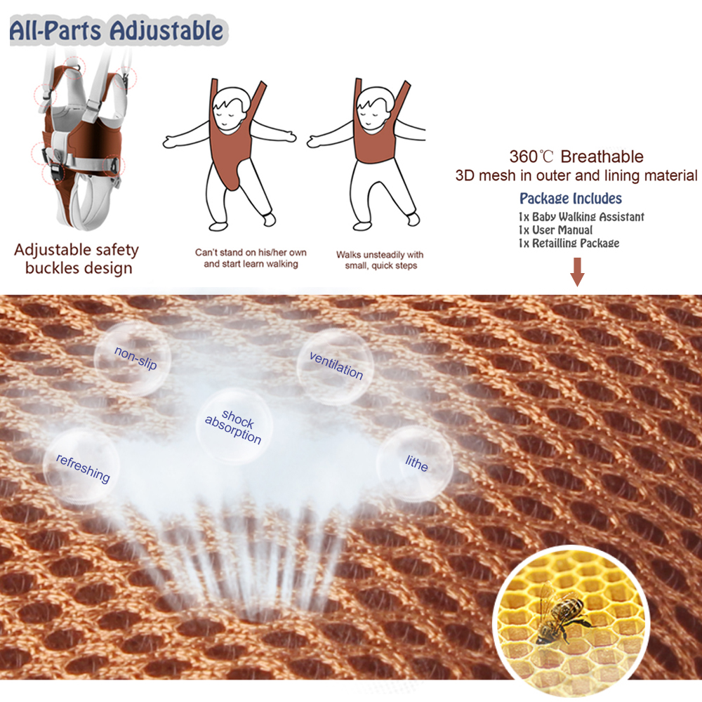 1.this baby walker harness toddler walking harness assures the safety and comfortable while learning to walk. And the high quality material for baby walking helper has good air permeability, can be used in all seasons.
