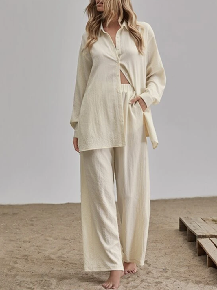 Casual Loose Solid Two Piece Sets Women Elegant Turndown Collar Cardigan Tops And Wide Leg Pants Suits Female Outfit
