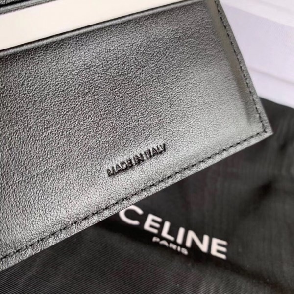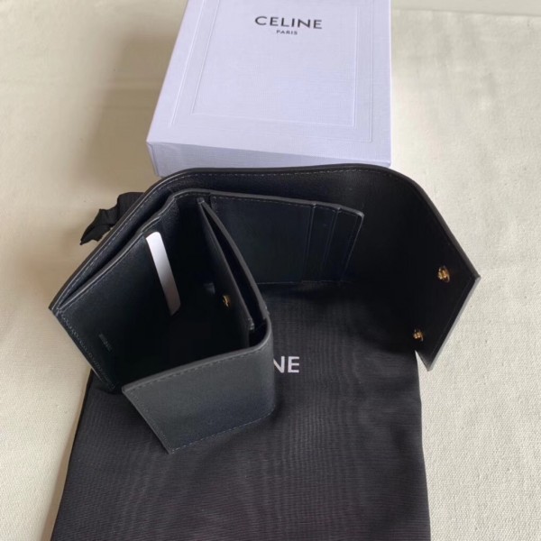 Crafted in grained calfskin leather by the House of Celine, this small trifold wallet with a flap offers enough space to fit into even a tiny bag or clutch, yet with space for coins, notes and credit cards, this neat wallet is the ultimate mini companion. Coupled with an elegant design with golden finishing touches.