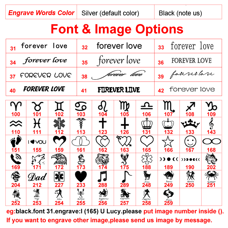 eg: Black font 50, engrave : Lucy (165) forever.