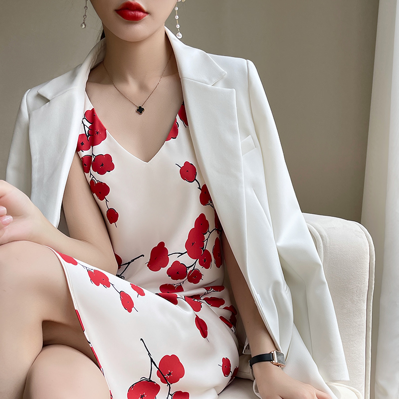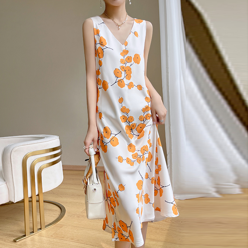 Explosive French Acetate Sling Dress Women's Summer Waist Long Skirt High-End Printed Skirt Suit Matching