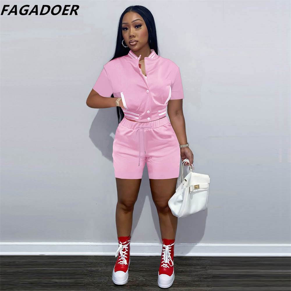 FAGADOER Casual Baseball Uniform Tracksuits Women Solid Button Short Sleeve Coat And Shorts Two Piece Sets Female Sport Outfits