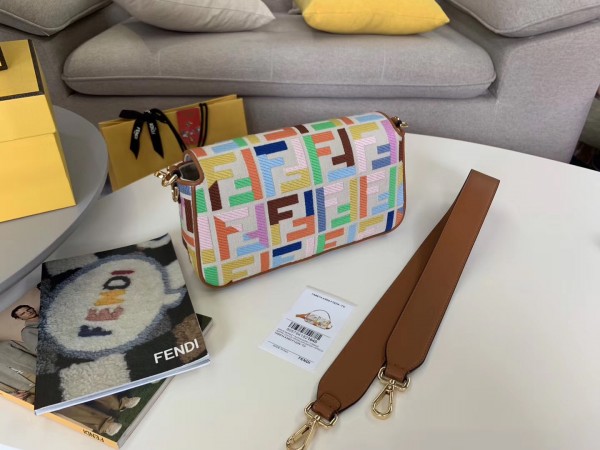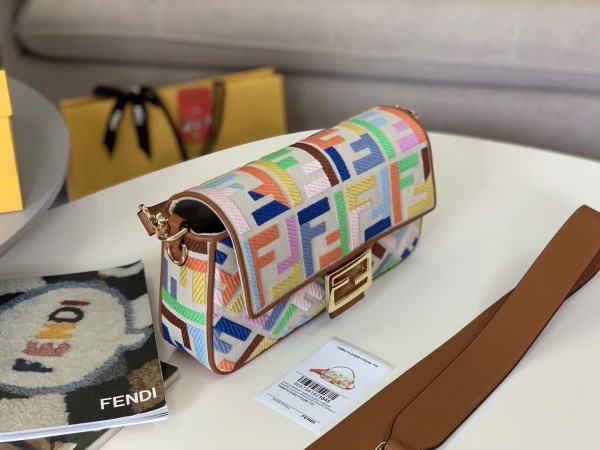 Iconic Baguette bag in medium size, with flap and FF fastening with magnetic clasp. Lining with zip pocket. Can be carried by hand or worn cross-body thanks to the handle and shoulder strap, both detachable. Made of beige canvas. Finished with FF motif embroidered in multicolour thread. Details in brown leather. Gold-finish metalware.