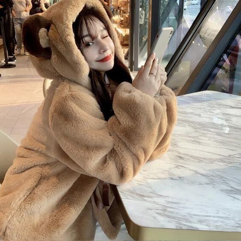 Fur Jacket Women Bear Ear Plush Jacket Winter Cute Preppy Style Oversized Hooded Loose Kawaii Fluffy