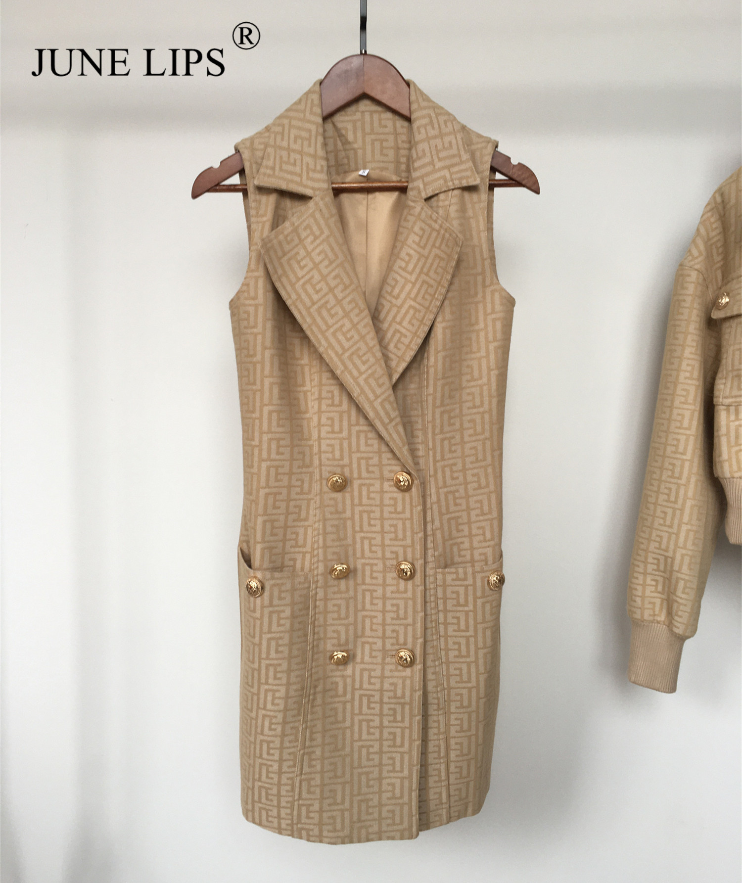 JUNE LIPS High Women's Sleeveless Shawl Collar Khaki Textured Long Jacket Wholesale