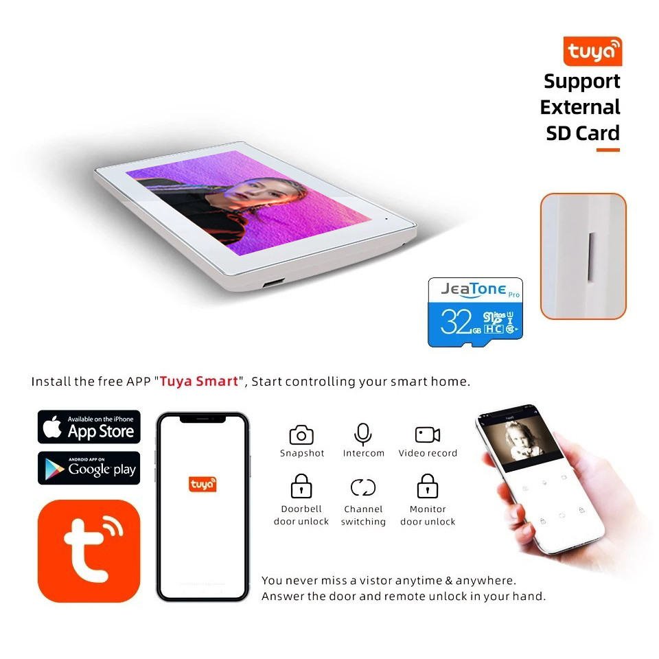 Connect with Tuya smarthome APP, you can remote ly control to monitor,take photo or video record.And you can talk to your visitors and unlock for them.