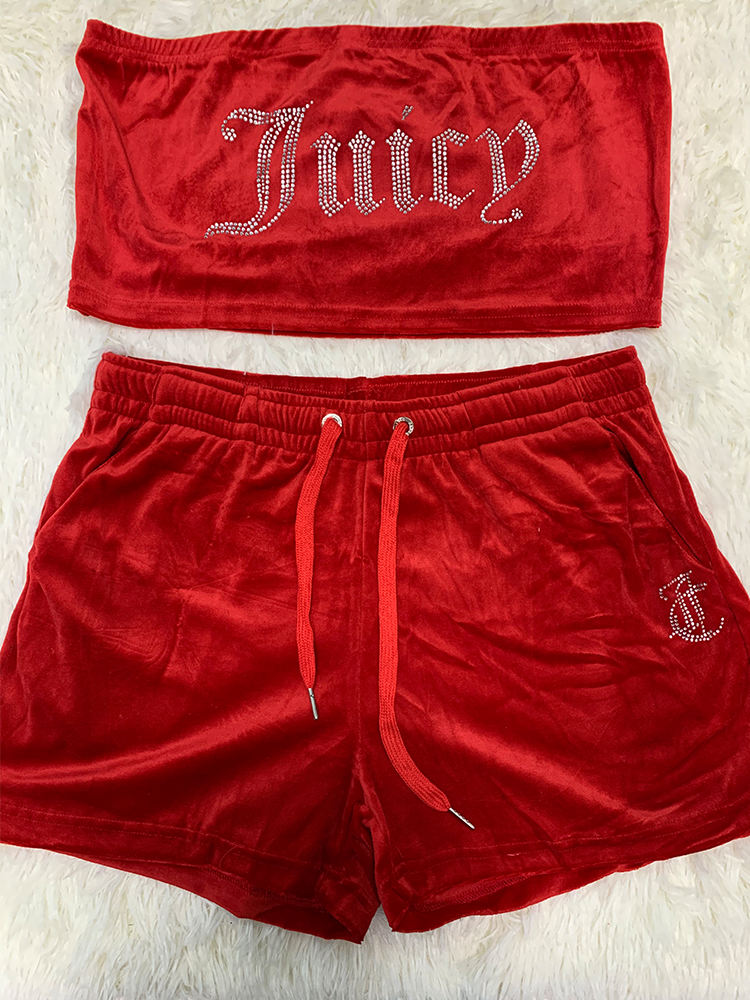 Juicy Apple Velvet 2 Pieces Sexy Tube Crop Top Casual Drawstring Shorts Set Loose Women Summer Clothes Tracksuit