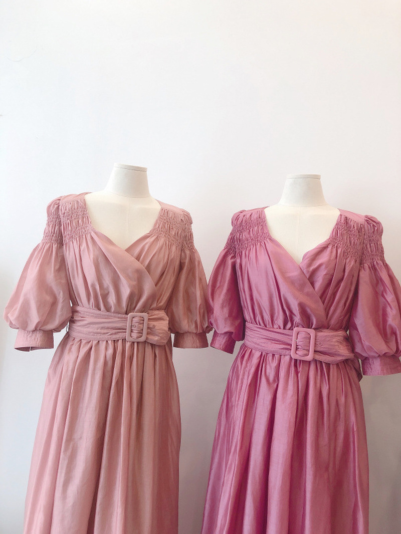 Kuzuwata V Neck Elastic Shoulder Lantern Sleeve Femme Robe Summer Vestidos Cross Slim Waist Pleated Solid Dresses with Belt