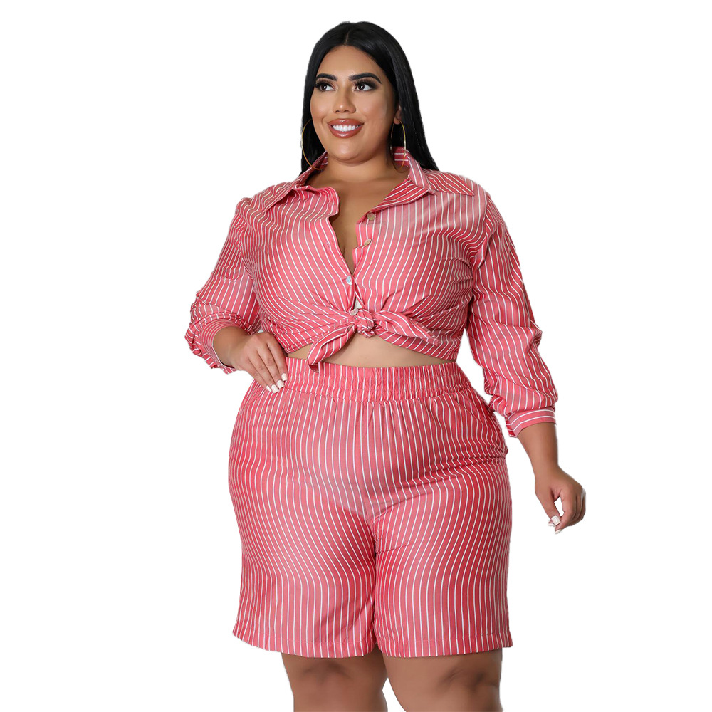 L-5XL Summer Plus Size Two Piece Sets Women Clothing Casual Loose Striped Shirt Short Suit Ladies Outfit Dropshipping