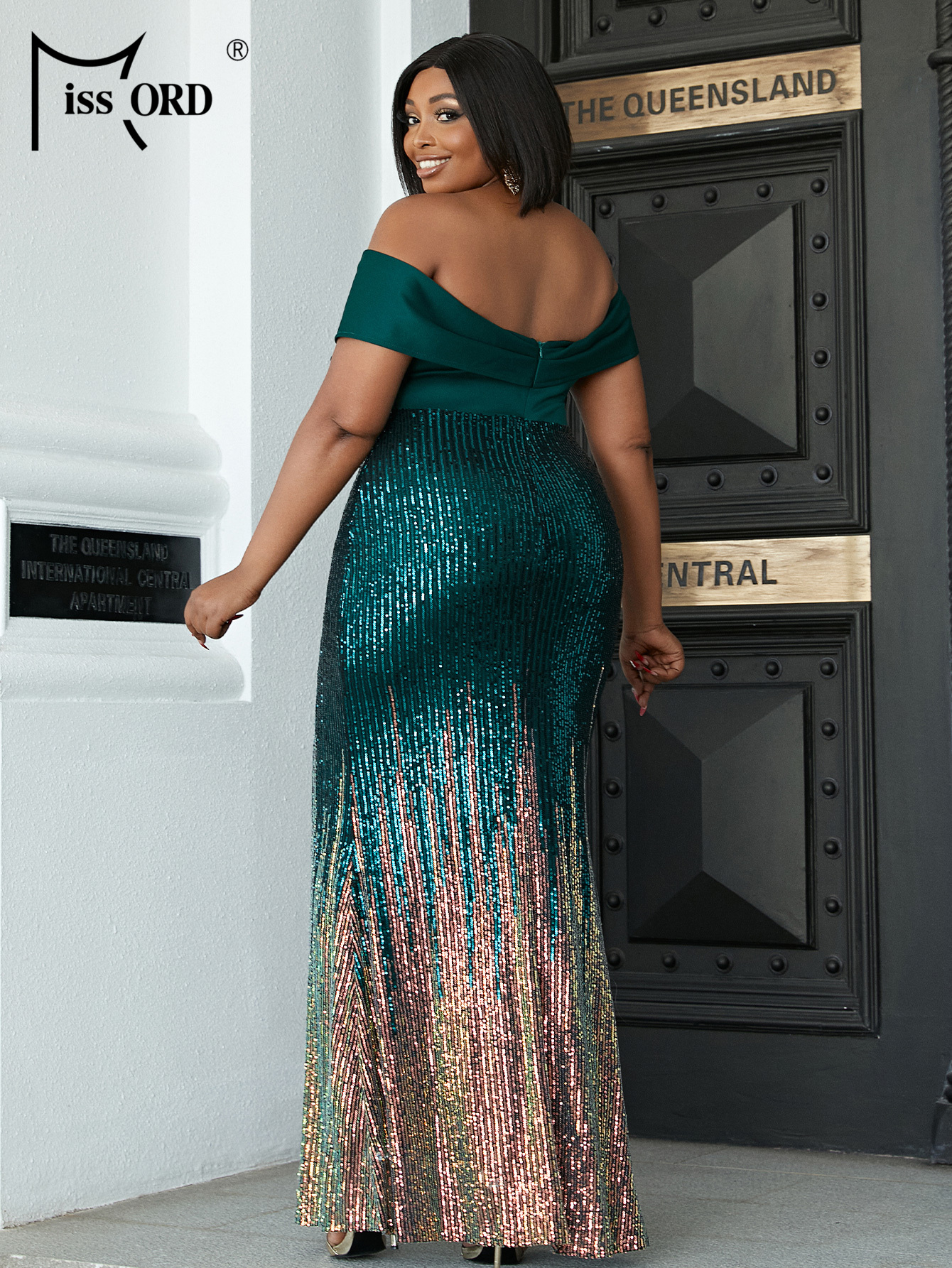 Missord Off Shoulder Sequin PlLUS SIZE Women Formal Dress Short Sleeve Large Maxi Evening Party Green Dresses Sexy Vestdios