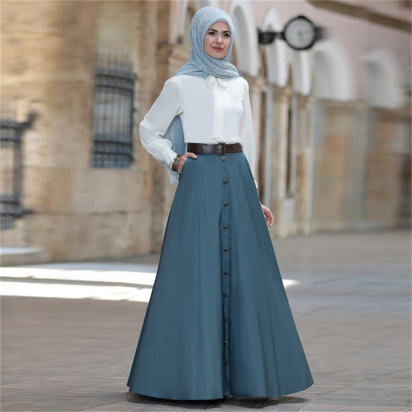 Muslim Elegant Skirt Islamic Dubai A-Line Pleated Turkish Solid Half Dress Hight Waist Big Swing Buttons Party Wear