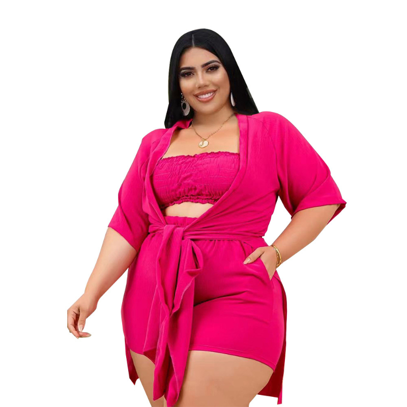 Plus Size Women Clothing Three Piece Set Sexy Wrap Crop Top Casual Lace Up Loose Coat Elastic Shorts Suit Ensemble Femme 5xl