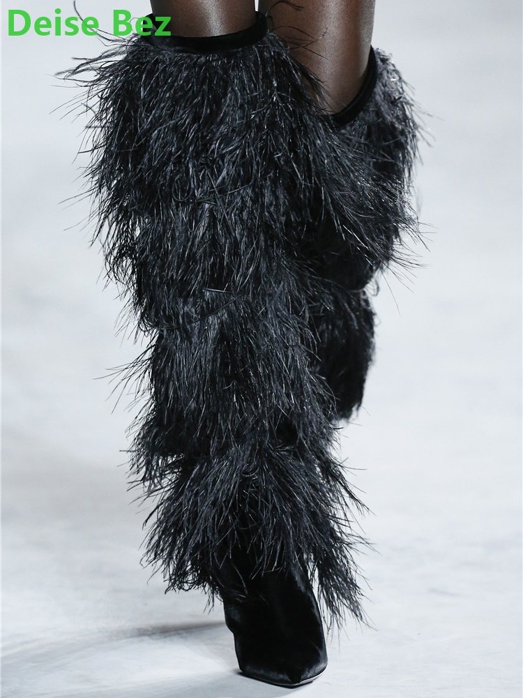 Runway Feathers Tassel Long Boots For Women 34-45 Size Solid Pointed Toe Thin High Heel Knee-High Handmade Sexy Shoes