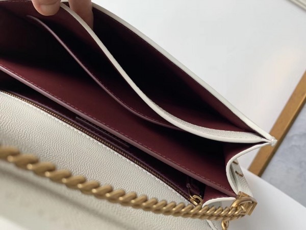 Offering a new rendition for the season, the much-beloved Cassandra bag by Saint Laurent is imagined in grain de poudre leather and adorned with studs to the side for a contemporary finish. Boasting the signature YSL hardware that aptly functions as a puzzle-like clasp, it features a sliding chain strap that makes wearing the design effortless, day or night.