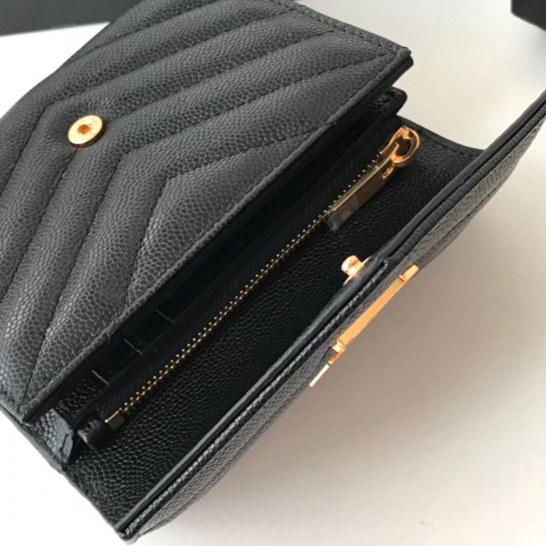 The Compact Tri Fold wallet looks chic in grain de poudre embossed leather, which is finished with interlaced YSL metal initials. Small enough to fit into even a tiny bag or clutch, yet with space for coins, notes and credit cards, this neat wallet is the ultimate mini companion.