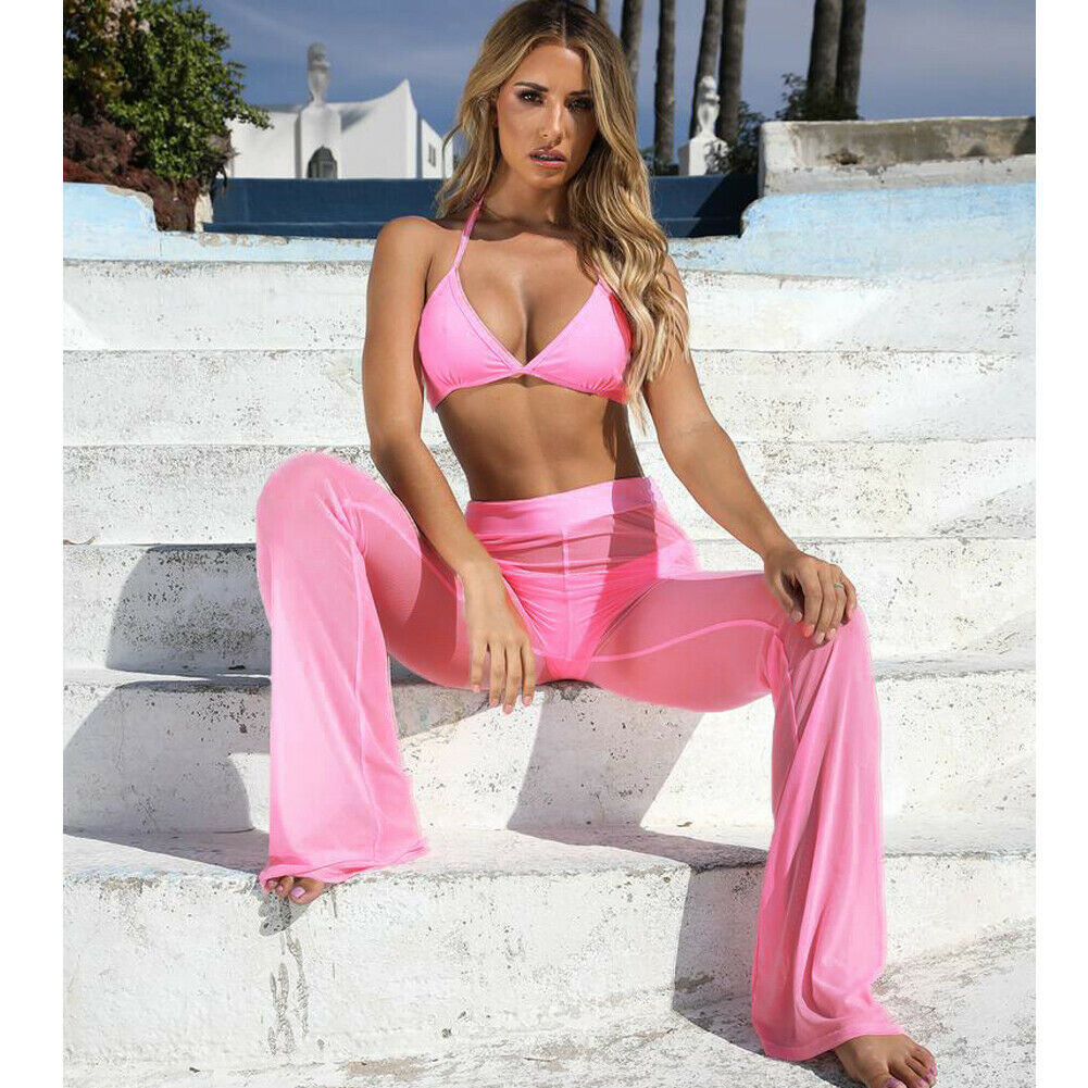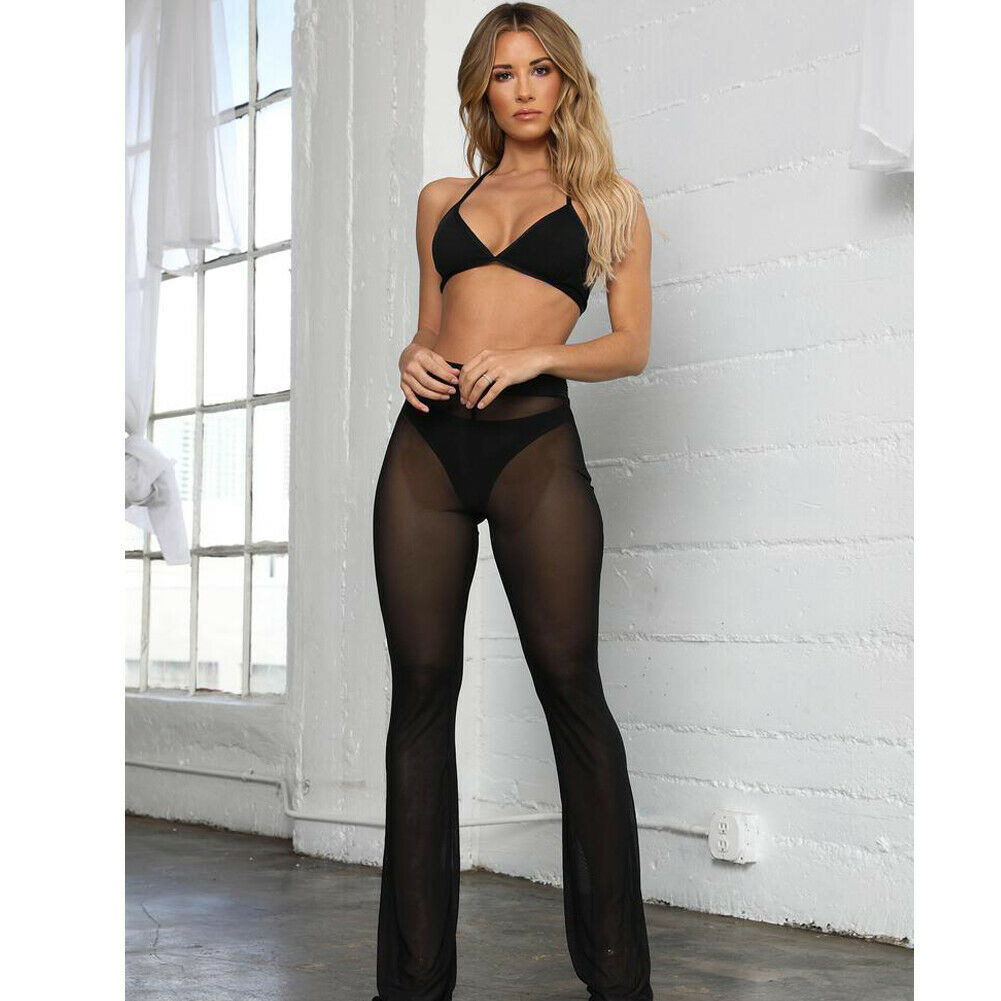 Sexy Women Beach See-through Mesh High Waist Elastic Sheer Wide Leg Pants Trousers Bikini Cover Up S-XL