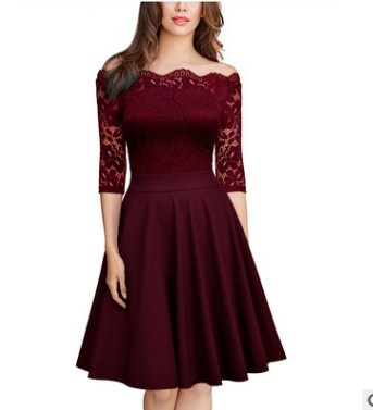 Summer Solid Color One Word Collar Dress Women Clothing Elegant Strapless Pleated Mid Calf Lace Dress Daily Evening Dresses
