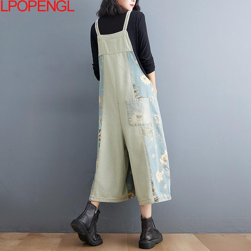 Summer Vintage Floral Jumpsuits Women Wide Leg Pants Suspenders Strap Pockets Denim Overalls Rompers Washed Jeans Playsuits