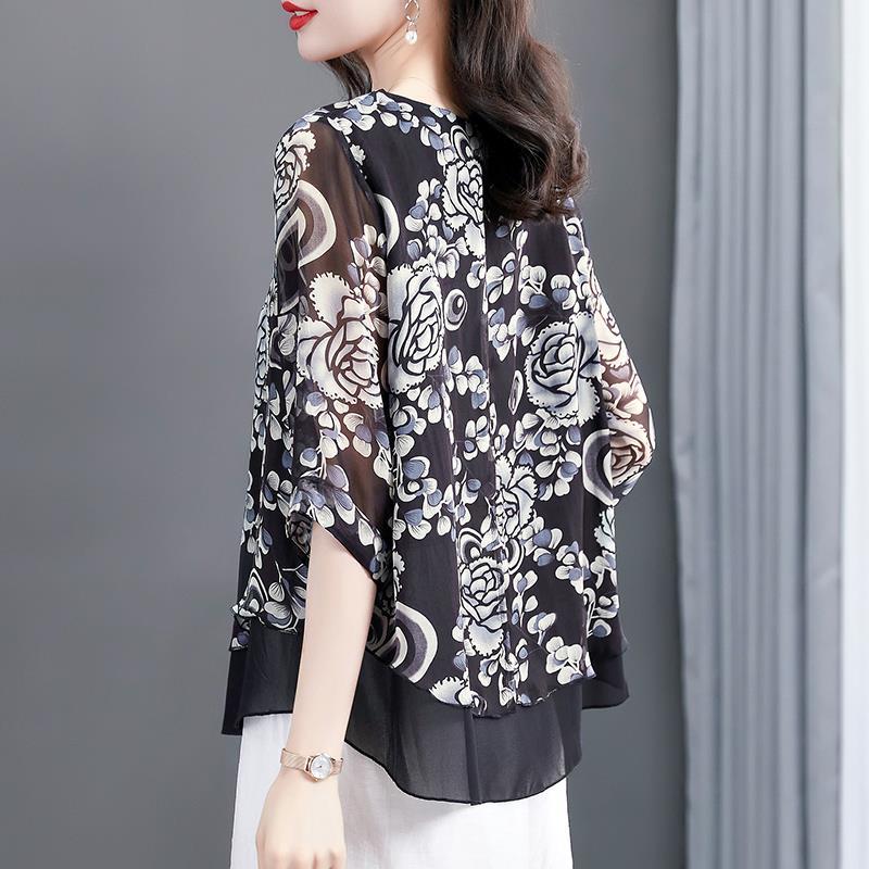 Summer Women Print Splice Casual Chiffon Blouses Shirts O-Neck Loose Tops Blusas Large SizeMM0132