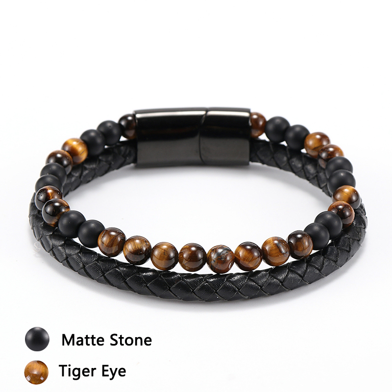 Item::Vintage Men's Jewelry Black Genuine Leather & Natural Stone Bead Bracelet Stainless Steel Magnetic Buckle Homme Wristband Bangle