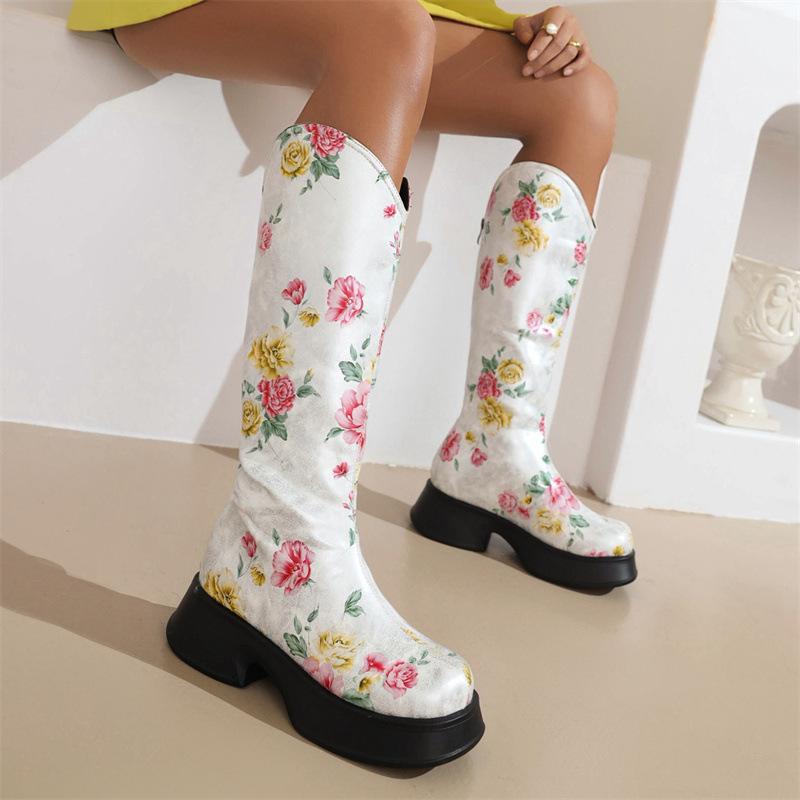 Women Boots 2022 Trend Luxury Winter Retro Round Head Small Platform Women Shoes Casual Mid Heel Print Ladies Knee High Boots