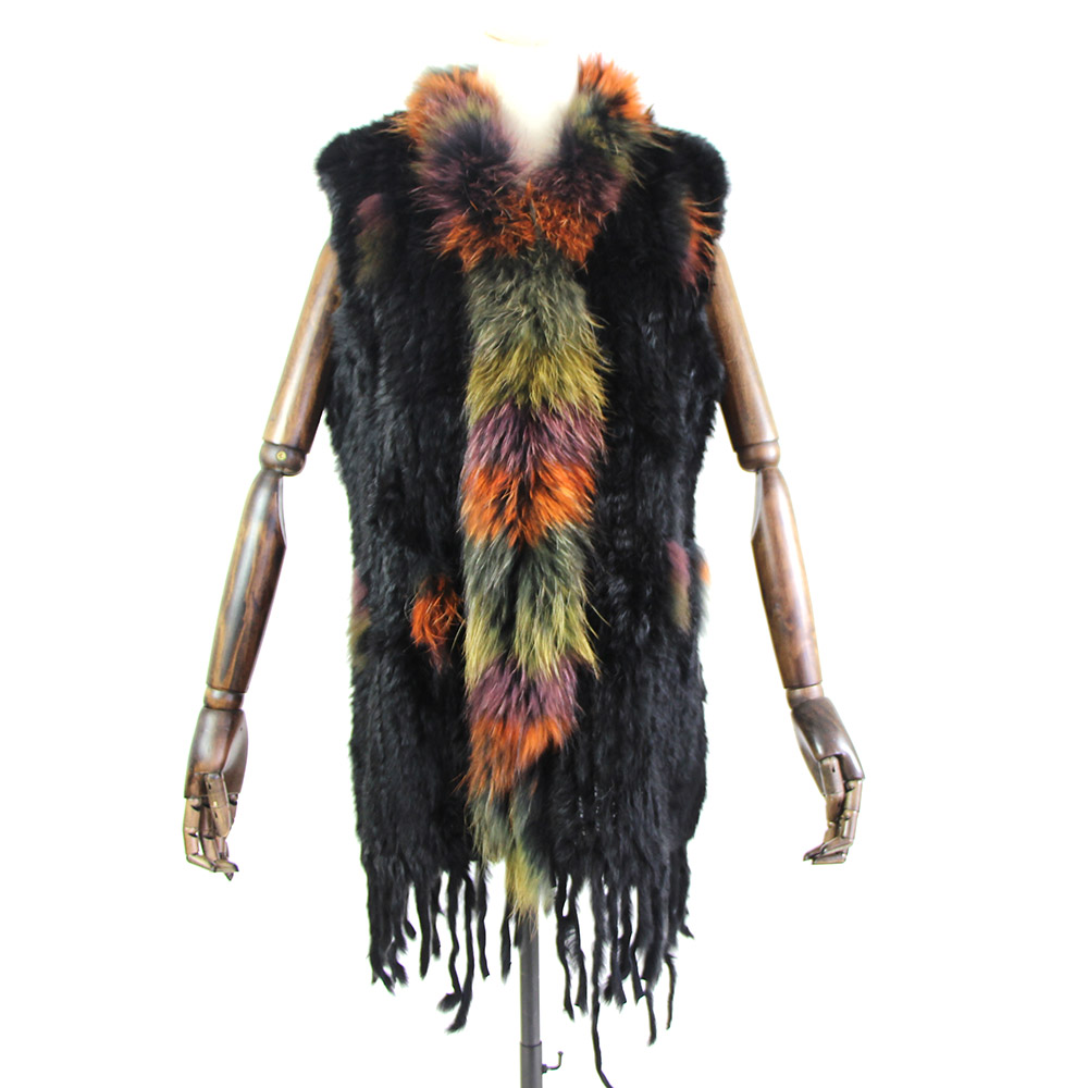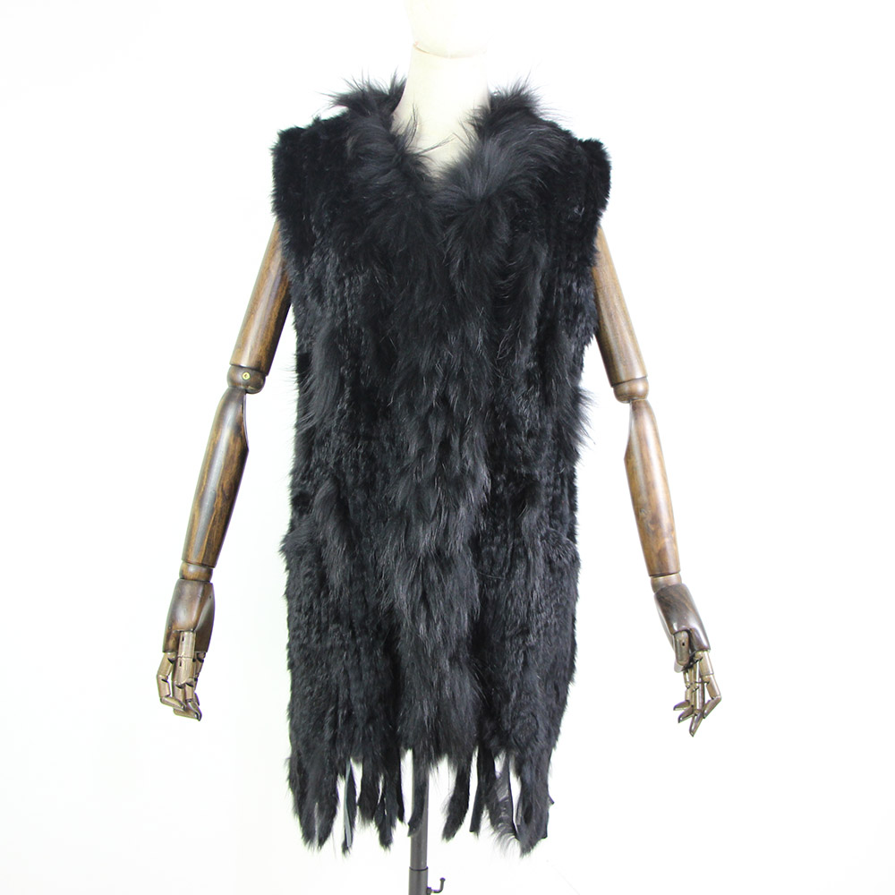 Women Genuine Natural Real rabbit fur Knitted Vests/Waistcoat/gilet coats with tassels Raccoon Dog Fur collar Long style