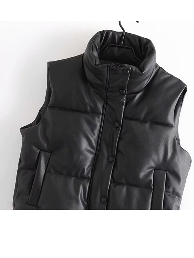 Womens Puffy Vest Down Vest Black Pu Leather Vest Woman Jacket Coat Autumn Winter Outwear Puffer Vest Female Sleeveless Jacket
