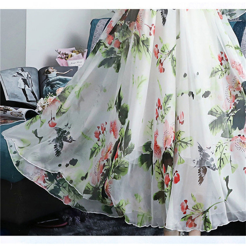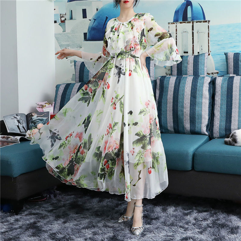 Women's Summer Fairy Elegant Floral Print Chiffon Party Long Dresses Ruffle Half Sleeve Lace Up A Line Maxi Dress Robe Femme