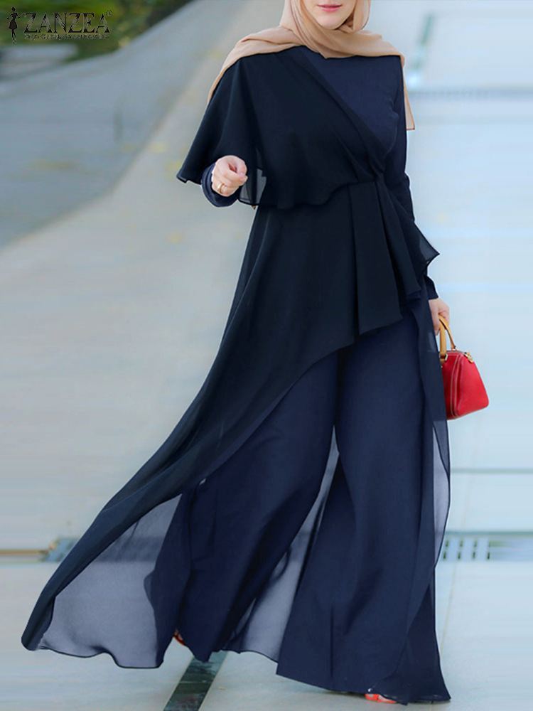 ZANZEA O-Neck Full Sleeve Wide Leg Romper Women Summer Lace Patchwork Muslim Jumpsuit Elegant Solid Long Party Overall Dungaree