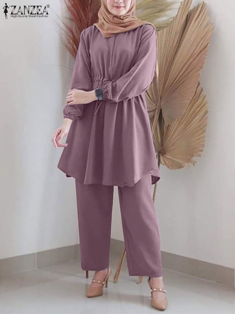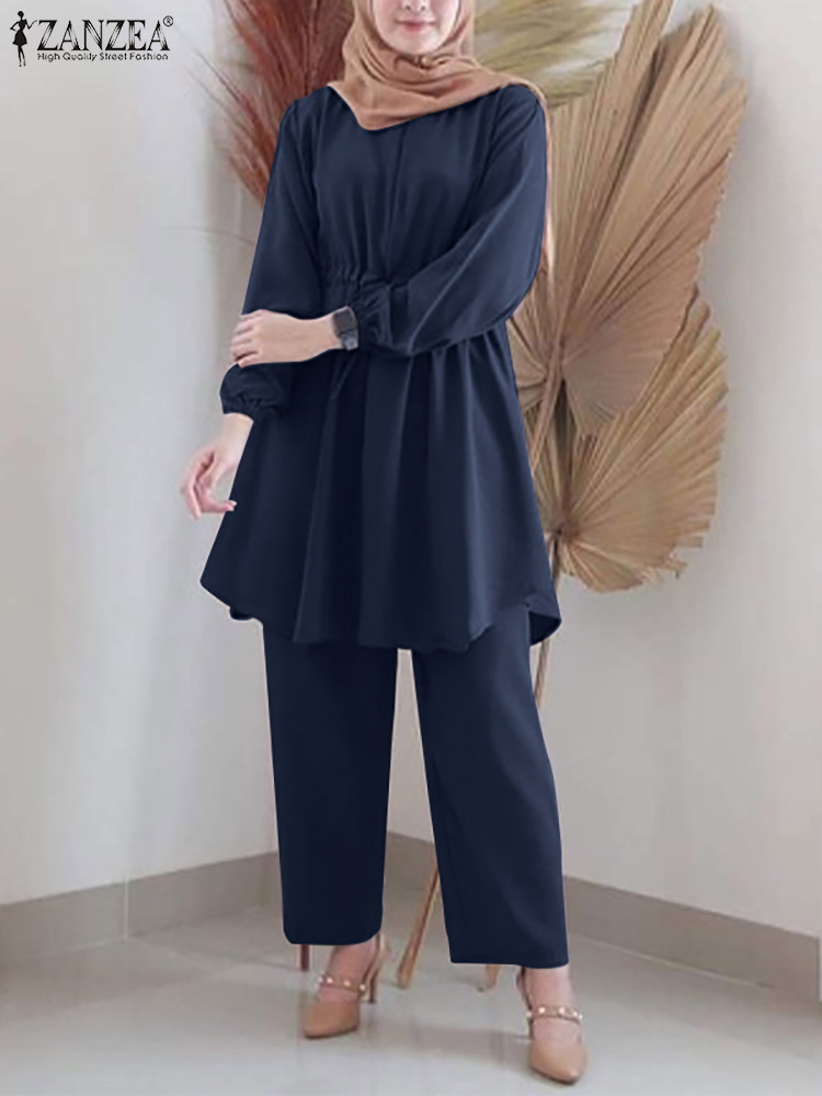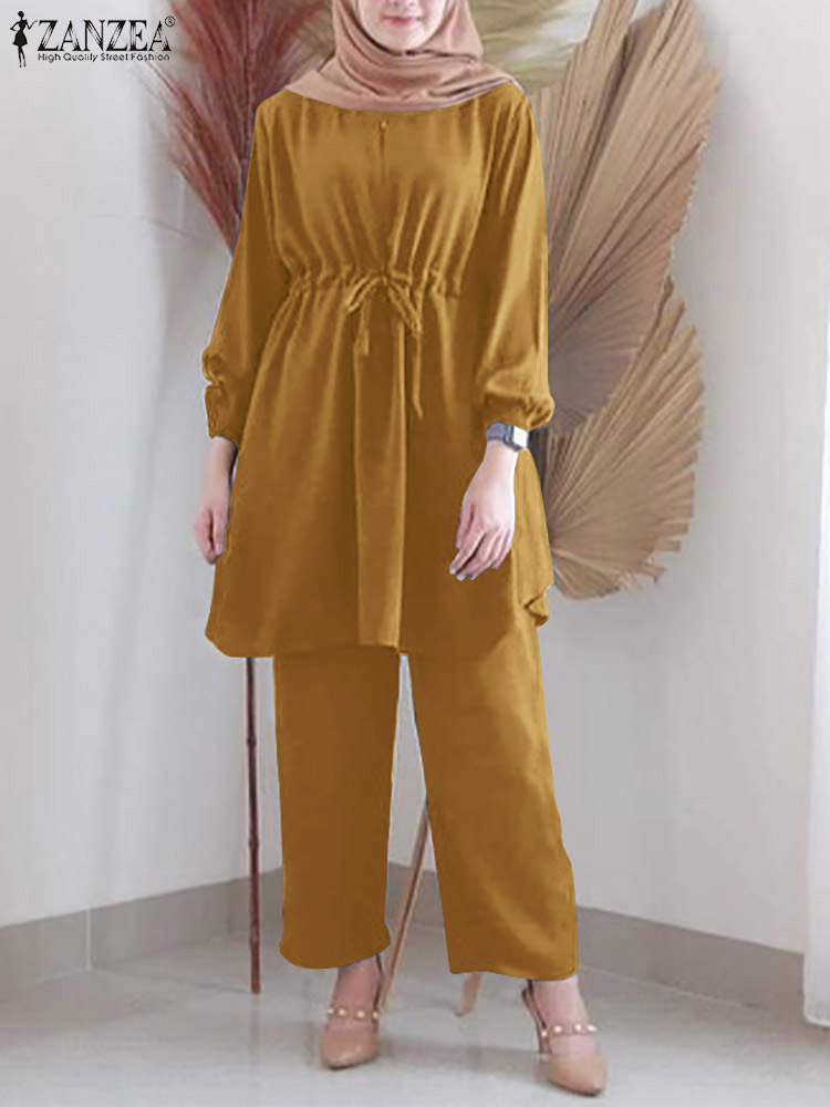 ZANZEA Woman Spring Islamic Clothing Muslim Sets Long Sleeve O-Neck Solid Blouse Wide Leg Pant Elegant Casual Loose 2PCS Suit