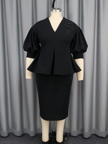 AOMEI Black 2 Piece Outfits for Women Formal Floral Appliques Drop Shoulder Top Plus Size Pencil Skirt Sets