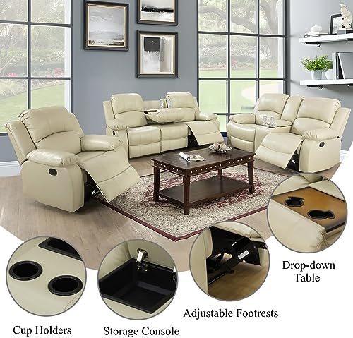 DescriptionThe sofa and loveseat come with build-in dropdown coffee tables, with its recliner design and rich bonded leather upholstery, this handsome sofa and loveseat set brings function and flair to your favorite seating group. Its solid color pattern pairs perfectly with monochromatic décor while its stitched details add a refined touch to your décor. Add this set to the living room to complement a traditional arrangement or use it to level out a crisp contemporary look in the den. For a more dynamic look, pair this set with breezy wicker-inspired furniture and a vase of bird-of-paradise leaves. Perfect for enjoying family movie night or relaxing with your latest read, this Foam-Filled seating Group rounds out any space in sophisticated style.