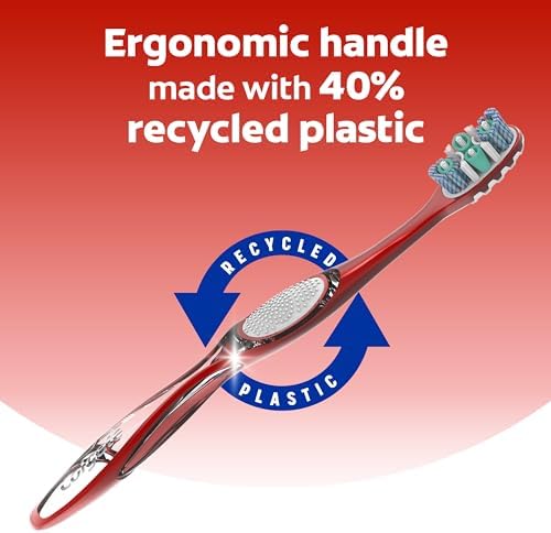 The Colgate 360⁰ Optic White Advanced medium whitening manual toothbrush features an advanced multi-action bristle design (vs. an ordinary flat trim toothbrush) and an innovative cheek & tongue cleaner design to remove bacteria from teeth, tongue, cheeks, and gums. The toothbrush also features spiral polishing bristles that help to remove surface stains from teeth, for a naturally whiter smile. It also features an ergonomic handle so that it fits comfortably in your hand. Flexible finger grips help the toothbrush to stay in place; reducing slippage and allowing for more precise maneuvering as you brush your teeth. Available in both soft and medium bristles.