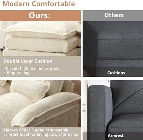 This seller and sofa EXCEEDED our expectations! I’m literally shocked at how amazing this couch is for the price after all I have seen. I paid for this couch myself so I’m giving my complete review.Details / pros/conshonest review ( full details for those contemplating this couch)I have been searching 5 years for a modular sofa that would offer maximum comfort, space, deep seats,and fit my small apartment. Something I could nap on, or watch movies!And be easy to move if ever needed since we rent.Price was a huge bonus. (Light weight too at 187 lbs )The couch ismore beautiful than the sellers pictures and the chenille fabric is actually pretty heavy duty, it’s soft to the touch but has a firm upholstery feel to it, which is good because it’s not flimsy. I was not expecting that to be as decent quality as it was. The seats hold their shape and cushions do not sag in.The cushions fit very tightly together and do not move around under you. The back cushions are perfectly firm but very comfy and you can adjust as you need,but when I get up from the couch it don’t allfall over or move around much. . The back cushions stay in place and occasionally I just adjust them which is no big deal.The ottoman Velcrosto its foundation base ( the sofa don’t need too)The sofa cushions are more solid, firm and extremely comfy. I didn’t expect that for the price. They are as good as any high end couch I lookedat for well over $3k. They do not move around either. And if I sit where cushions join you don’t sink into a hole.The sofa is VERY large…so keep that in mind and measure you space. Measurescorrectly to the sellers specifications.It’s not purewhite but rather a soft warmcream. Perfect color! It’s not cheap looking at all. It looks like many high end cloud sofas but this is more comfy. It’s a sturdy couch.Now what I didn’t likethis sofa is very low to the ground for such a beautiful statement piece …so after reading many reviews we opted to follow suit and ordered 8 inch recommended wood legs in light color. It made this sofa in my opinion nice and high-end to match the beauty….my feet don’t touch the floor now, but that’s what I prefer. The extra height makes it look elegant, completed and balanced…but my husband has a low Footstool on his end of the sofa.However I do suggest you go with a minimum of 6 inch legs if you don’t want 8 inch legsheight ( it comes with 3 inch black plastic legs ) personally I like a higher sofa so I think 8 inch legs are the best fit for the couches size/ balance.Don’t forget you need 16 legs to redo this sofa as each seat has its own 4 legs plus the ottoman. Buy your legs in a 2 sets of 8 pack to save money. I think I paid $50 for 16 legs.I wanted to add storage baskets under the couch so I went with 8 inch max for more storage options under it.Overall we love this sofa,if something changes over time I’ll update my review. SOit’s 5 stars for now and I do recommend it if your on the fence….and this particular seller! I think it’s an incredible bargain for the modest price,with everything I wanted in a extremely beautiful sofa. Everyone that’s seen it absolutely raves over this couch.Takes about 45 minutes to 1 hour to assemble. Make sure you don’t pre open any bags before starting and keep each boxes (3 boxes) contents together in groups…as each section is marked according to instructions. Also check off all parts before starting to make sure nothings missing. Comes with a straight forwards manual to assemble even if you have little to no experience.Cushions are extreme vaccume packed flat but they will expand /adjust over 72 hours …<br />My sofa arrived much earlier than anticipated maybe 8 to 10 days after buying.Seller was great too, highly recommend! Thankyou.