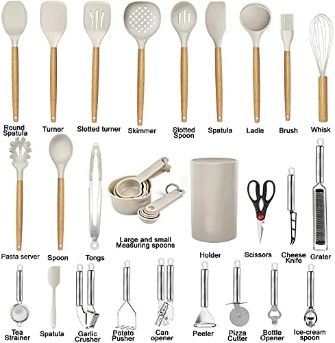 Round Spatula; Turner; Slotted Turner; Skimmer; Slotted Spoon; Spatula; Ladle; Brush; Whisk; Pasta Server; Spoon; Tongs; Holder; Scissors; Cheese knife; Grater; Strainer Spatula Garlic Crusher; Potato Pusher; Can Opener; Peeler; Pizza Cutter; Bottle Opener; Ice-cream Spoon; Large and Small Measuring Spoons