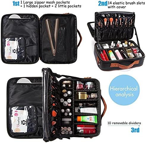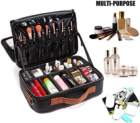 LACATTURA Travel Makeup bag, Leather Makeup Train Case Cosmetic Organizer for Makeup Brushes Toiletry Digital Accessories, Portable Artist Storage Bag With Shoulder Strap for Women lady Black, Large