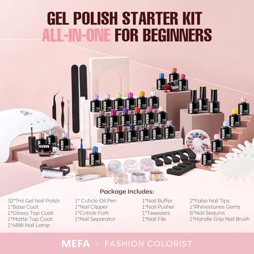 MEFA 56 Pcs Gel Nail Polish Kit with U V Light, 32 Colors All Seasons Soak Off Gel Polish Nail Set with Matte/Glossy Base Top Coat Essential Manicure Tools Nails Art DIY Christmas Gifts for Women
