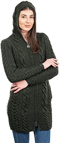 Stay warm and fashionable this fall and winter with this Aran Cable Knit Hooded Zip Cardigan. This Cardigan is made of 100% Merino wool, which will keep you insulated and comfortable outside in the cold with its warmth, moisture-wicking breathability, and rich softness. Giving this piece its fresh style versatility and practicality is a hoodie that can be worn up or down. The full zipper and side pockets also bring chicness and practicality, as the zipper is perfect for quickly layering up or down and the pockets are convenient for holding small items or warming the hands. This hoodie is perfect for everyday wear and will definitely become a wardrobe favorite!