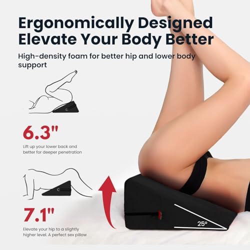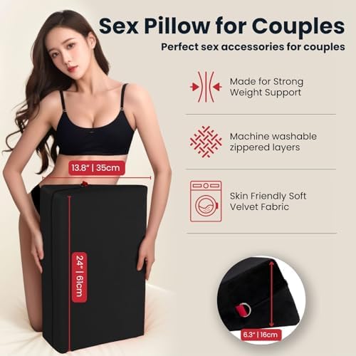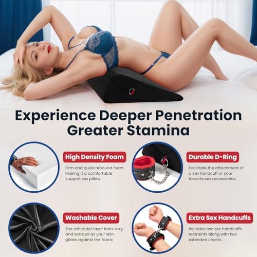 I have to share my excitement about the High Density Foam Sex Wedge Pillow with 2 BDSM Bondages!! It's a game-changer for anyone who is looking to amp up their intimate moments! Bought this one because it’s much cheaper and look decent. It turns out it’s very similar to the Liberator’s one.This sex pillow is a total win! The high-density foam not only supports my weight (around 150 lbs) when I place it under my hip like a champ but also takes our intimate positions to a whole new level of comfort. Seriously, it's like upgrading to first-class for your bedroom adventures. It really does help with penetrating the right spot.And guess what? It's not just about the support. The sex wedge pillow features two zipper layers – one is moisture-repellent, so no need to stress about spills, and the other is machine-washable soft velvet fabric. Talk about practical and easy to maintain!The packaging is fantastic, and they even throw in a 2-year warranty – peace of mind for the win! Unboxing it felt like Christmas morning, and the quality is top-notch. It's like they thought of everything to make sure you have the best experience possible.It also comes with two black and red BDSM bondages. They're there, they're adjustable, and they add a hint of excitement. But honestly, the star here is the pillow itself. And we love the color theme too! Black and red look gorgeous.If you're into exploring new dimensions of pleasure with sex furniture and sex toys, this sex pillow is a must-have. It's not just a pillow; it's an upgrade to your entire intimate experience. Trust me; you won't be disappointed!