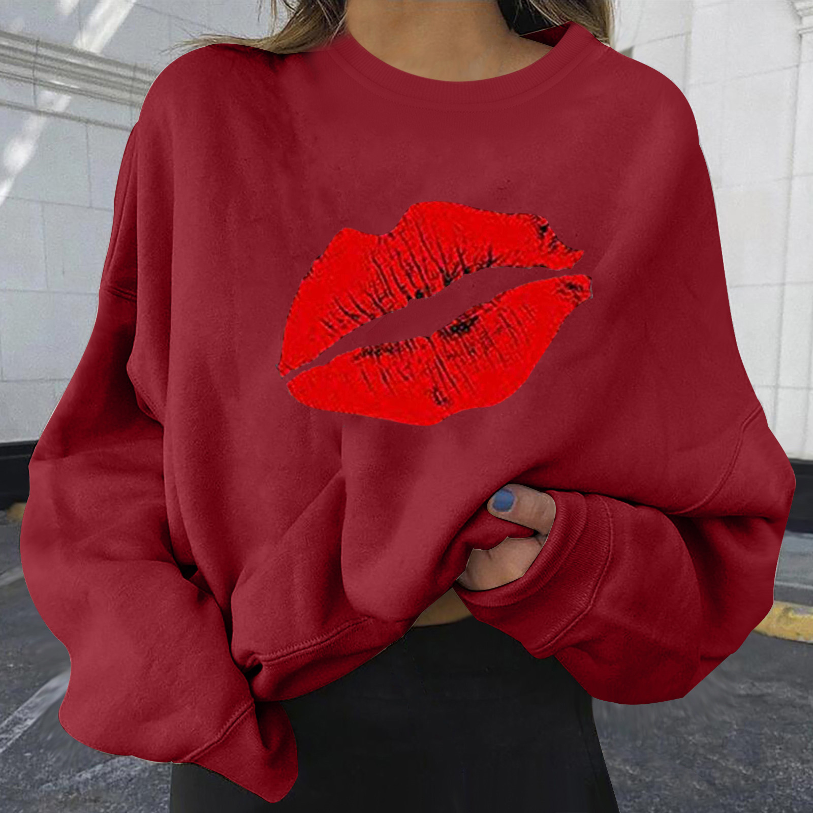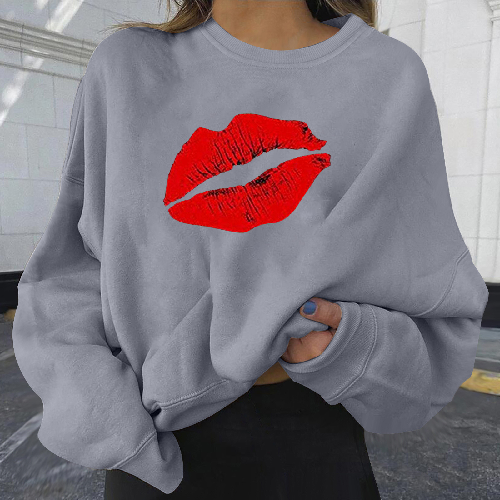4# Women Plus Size Sweaters Long Sleeve Color Block Lip Print Straples Collar Sweaters Top Autumn Spring Pullover Свитер Женский