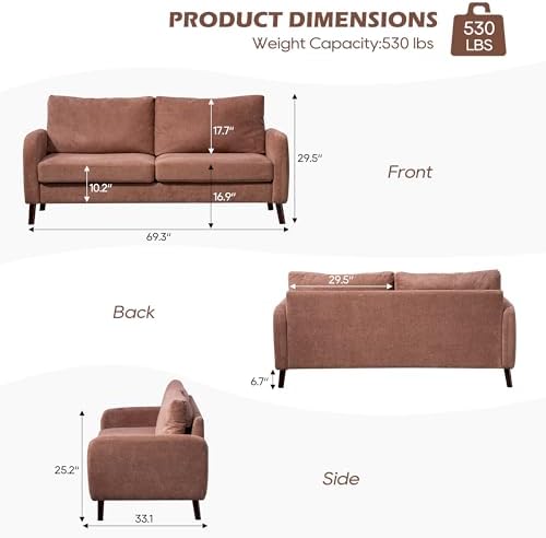 This loveseat sofa is compact and fits perfectly next to my bed. Though it doesn't appear large, the seating area is spacious enough for 2-3 adults. Its wooden legs are designed to be non-slip, making it suitable for any type of flooring. Overall, it adapts well to various spaces and is very comfortable. If you're unsure about which sofa couch to choose, this one is a great option!