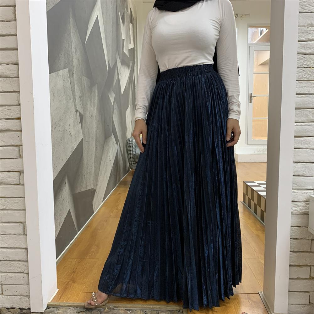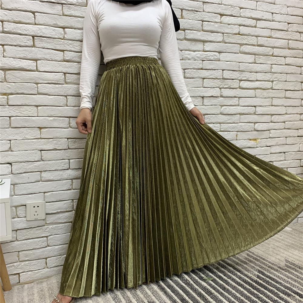 Arrivals Metallic Pleated Maxi A-Line Autumn Winter Long Skirt Solid Satin Pleated Maxi Skirt Muslim Women's Islamic Turkey