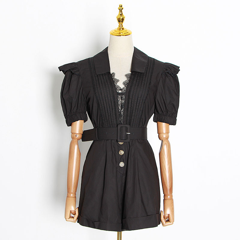 BUSHRA Casual Patchwork Lace Women Short Jumpsuit V Neck Lantern Short Sleeve High Waist With Sashes Hollow Out Playsuit Female
